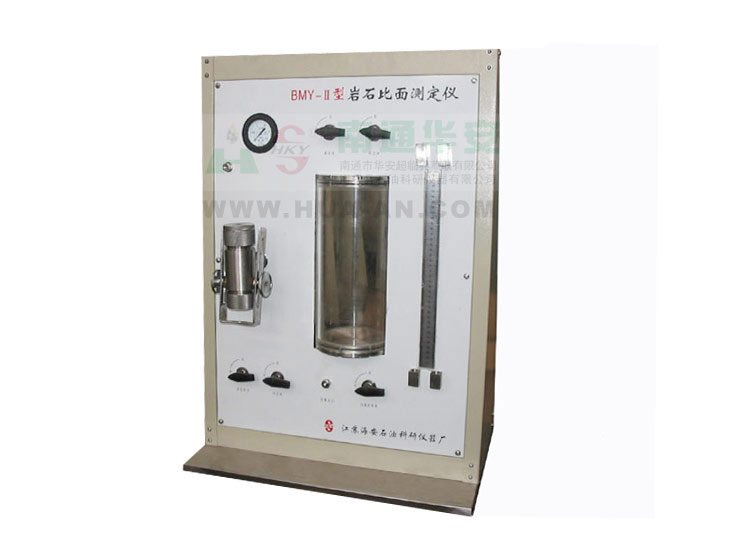 岩石比面仪主要由岩心夹持器、压差计和空气唧筒组成。测定打开排水开关,水从唧筒中流出,瓶内压力降低,空气从进气孔经岩样进入唧筒内。当压差计上的水柱高H一定时,进入的空气量等排出的水量,用量筒量出相应压差下流出的水量,便可按公式计算出岩样的比面。